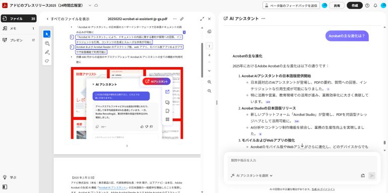 リンクを共有された記者は、好きなタイミングで「PDFスペース」にアクセスし、AIアシスタントに質問できる。「たとえば『Acrobatの主な進化は?』といった質問をすれば、格納されているリリース情報を元にAIアシスタントが回答してくれます」といった具合。広報部は問い合わせを減らすことができるし、記者もウェブサイトからプレスリリースを探してダウンロードし、見比べる手間が省ける。「AIはプレスリリースに書かれている内容から回答するため、間違ったことが伝わらない」という安心感もある。