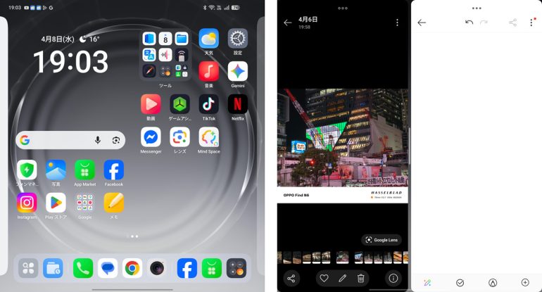 また、PCのようにアプリ間のドラッグ&ドロップによる操作にも対応している。例えば、撮った写真を開いてメモアプリにドロップすると、そのままメモの中に画像を貼り付けることが可能。一般的なスマホだと画面が窮屈に感じてしまうかもしれないが、8.12インチもあると、直感的に操作できる。