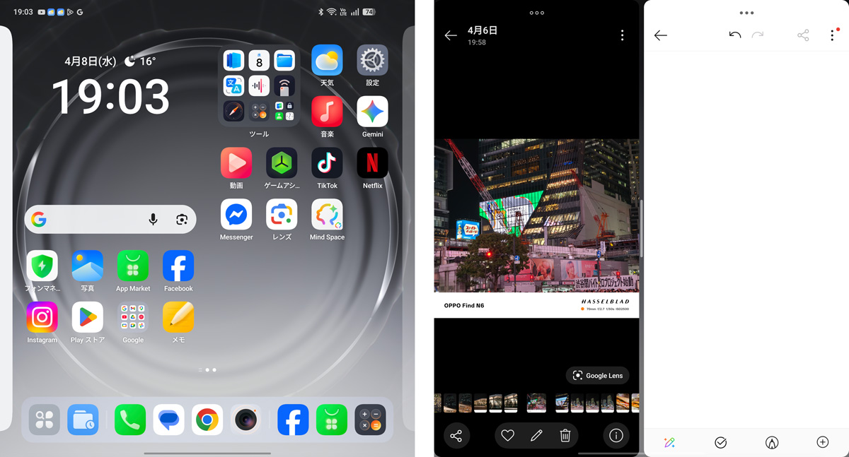 フラッグシップモデルの「Find X9」で搭載したマルチスペクトルセンサーも採用しており、色がかなり正確。料理や夜景などの撮影に大活躍することは間違いない。ハッセルブラッドのカメラを模した「XPAN」モードにも対応しており、横長の写真を撮ることもできる。フォルダブルスマホの利便性と、OPPOのフラッグシップモデルのカメラ機能が融合した1台だと言えそうだ。