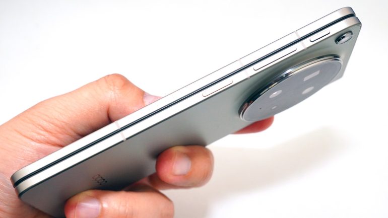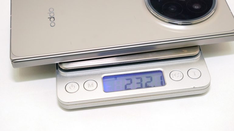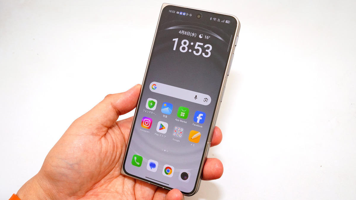 開閉は非常に滑らかで、軽く力をかけるだけでいい。また、開閉の途中で止めた際にも、安定感がある。半開きにした状態でも、使いやすいと言えるだろう。閉じたときの厚みは8.93mm。Galaxy Z Fold7の8.9mmにはわずか0.03mm及んでいないが、フォルダブルながら、通常のスマホと変わらない厚みの範疇には収まっている。重さも、225gでフォルダブルスマホの中では比較的軽量だ。