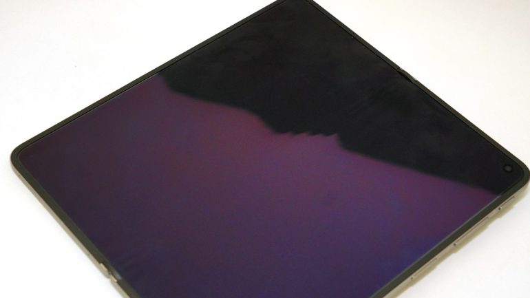 実際の見た目は次のとおり。試用時に何度も開閉しているが、確かにヒンジ部分の折り目はほとんど見えない。ただし、折り目がまったくないかと言えば、そうではない。わずかながら、折り目のような筋は存在する。タッチした際には凹凸を感じづらいが、軽い段差はある。あくまでも、目立たないという方が正確な表現だ。