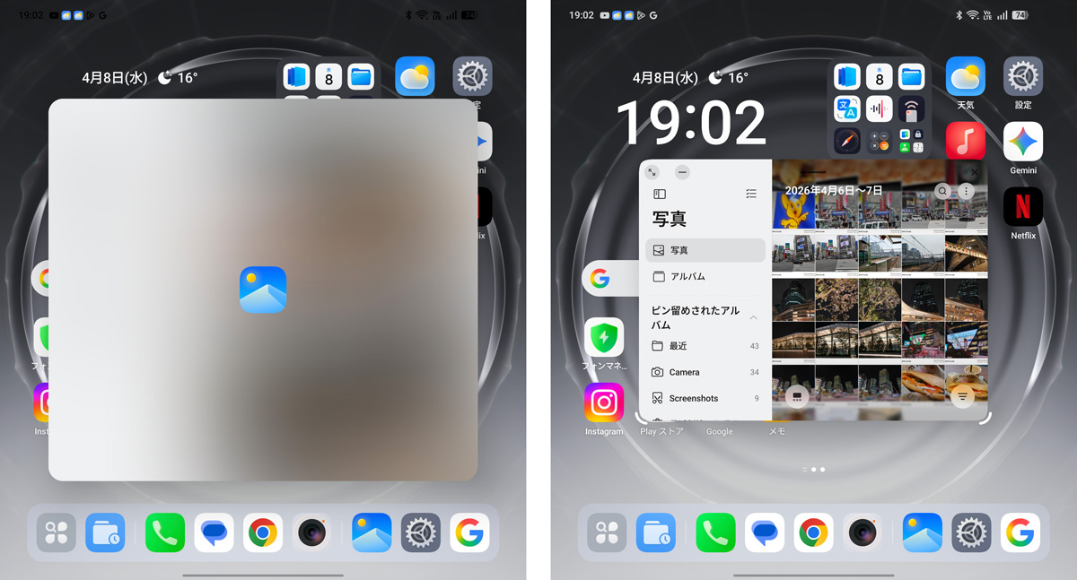 ソフトウェアも、大画面に最適化されていて使い勝手がいい。アプリは、「フローティングウィンドウ」として表示することが可能。Geminiのスワイプでの呼び出しがオフになっている状態であれば、画面右下から中央に向けてスワイプするだけで、表示中のアプリがウィンドウになる。ウィンドウは最大4つまで表示可能。PCのような感覚でウィンドウを行き来できるため、複数のアプリをまとめて動作させやすい。