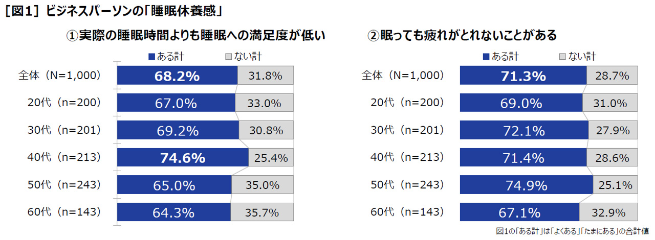 そこで、ビジネスパーソン1,000人に自身の睡眠について聞くと、68.2%が「実際の睡眠時間よりも睡眠への満足度が低い」と回答し、40代が74.6%と最も高くなっている。また、ビジネスパーソンの71.3%が「眠っても疲れがとれないことがある」と回答している[図1]。