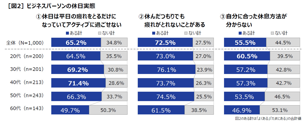 また、ほぼ4人に3人(72.5%)は「休んだつもりでも疲れがとれないことがある」と回答しており、20~50代では7割以上が疲れがとれない状態だ。ビジネスパーソンの多くが、うまく休めていないようで、半数以上(55.5%)が「自分に合った休息方法が分からない」と回答し、年代別では20代が60.5%と最も高くなっている[図2]。