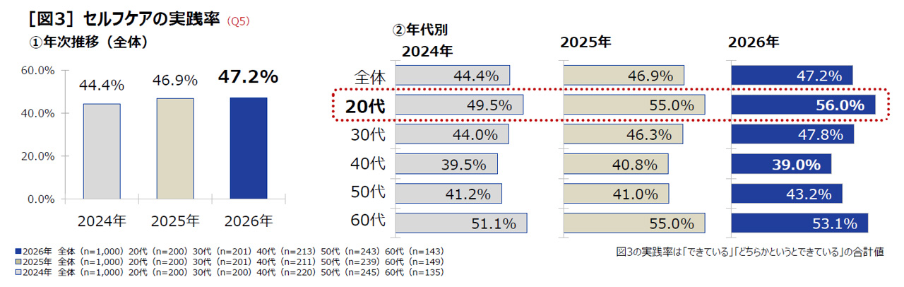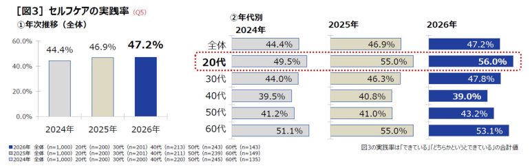 自分自身で健康を守り対処することを「セルフケア」と呼ぶ。自身のセルフケアについて聞くと、47.2%が「セルフケアができている」と回答しており、2024年44.4%、2025年46.9%と、実践率は緩やかな増加傾向を示している。