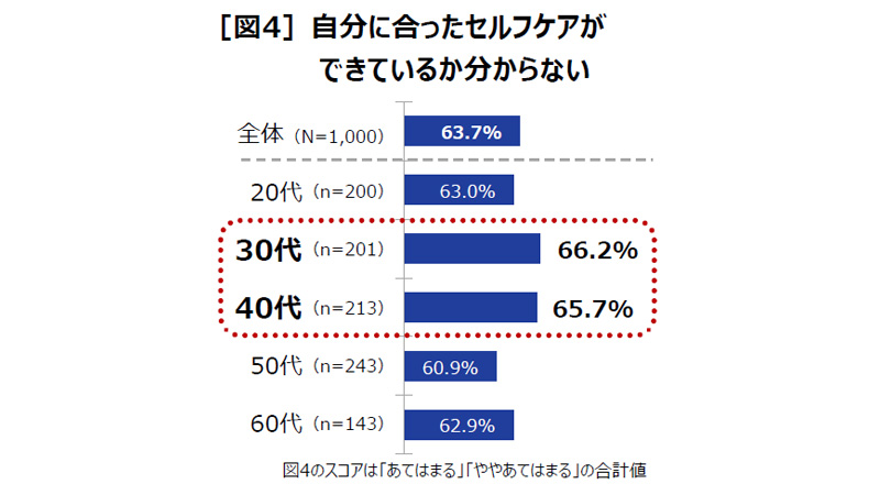 実施率は緩やかに増加する一方、63.7%は「自分に合ったセルフケアができているかわからない」と回答し、30~40代の働き盛りが最も多くなっている[図4]。