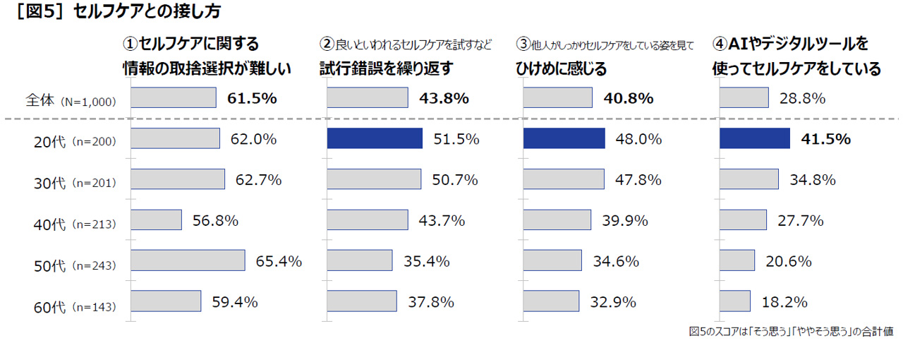 20代はいずれのスコアも高く、「AIやデジタルツールを使ってセルフケアをしている」が41.5%と、全体(28.8%)や他の年代に比べ、高くなっている[図5]。