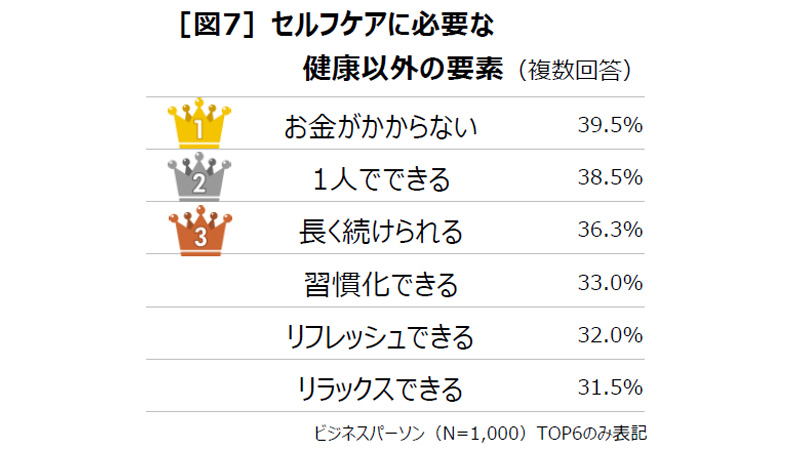 20~60代ビジネスパーソンの66.3%が「自分に最適なセルフケアの方法を見つけたい」と回答している[図6]。そこで健康以外でセルフケアとして取り組みたいと思える要素を聞くと、「お金がかからない」(39.5%)、「1人でできる」(38.5%)、「長く続けられる」(36.3%)に加え、「リフレッシュできる」(32.0%)、「リラックスできる」(31.5%)が上位となり、心や感情などの精神面における効果も重視されていることがわかった[図7]。