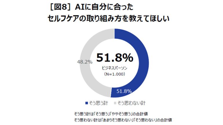 また[図5](4)の通り、AIやデジタルツールを使ってセルフケアをしている人は28.8%だったが、51.8%が「AIに自分に合ったセルフケアの取り組み方を教えてもらいたい」と回答している[図8]。今後のAI活用は、さらに増えていきそうだ。