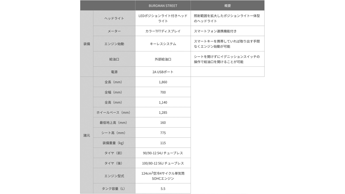 今回の全面改良では、デザインを一新しつつ装備を充実させ、ラグジュアリースクーターにふさわしい、使いやすく上質なコミューターに仕上げた。なお新型「バーグマンストリート」は、2026年4月よりインドで販売を開始し、100以上の国・地域に順次輸出を開始する予定となっている。