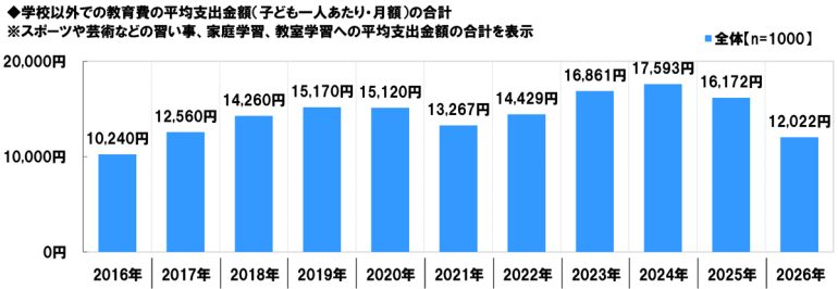 学校外教育費の平均支出金額は12,022円/月、すべての就学段階で昨年調査から減少し、全体平均では4,150円の大幅減少