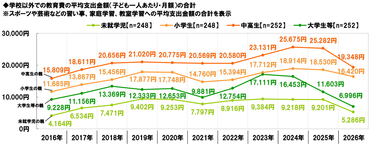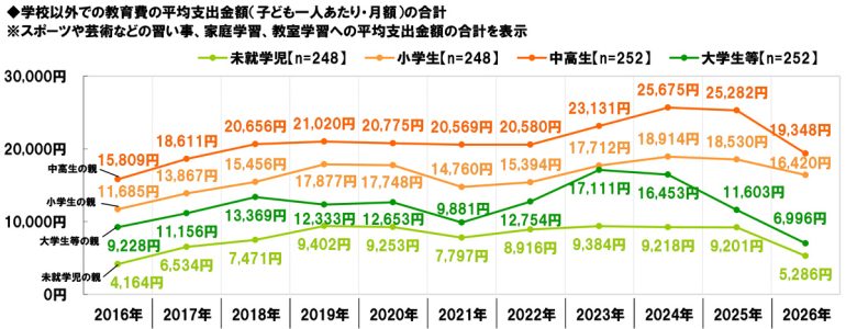 平均支出金額の合計を昨年の調査結果と比較すると、すべての就学段階において減少した。特に中高生の親では、平均金額は例年同様最も高くなっているものの、2025年25,282円→2026年19,348円/月と、5,934円減少し、減少幅は最も大きくなった。