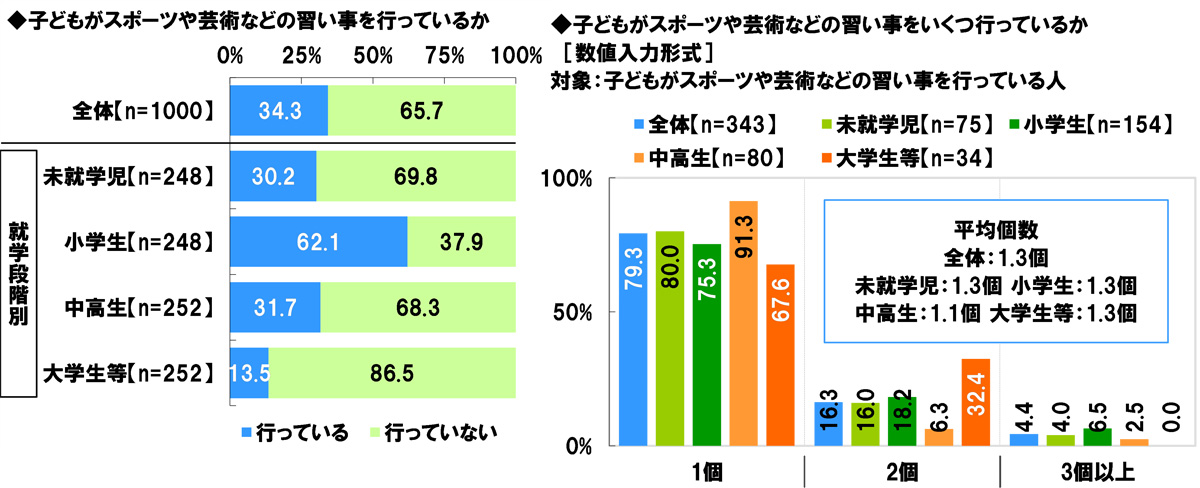 全回答者(1,000名)に、子どもがスポーツや芸術などの習い事(水泳やダンス教室、ピアノ教室、運動系部活、文化系部活など)を行っているか聞いたところ、「行っている」は34.3%、「行っていない」は65.7%となった。子どもの就学段階別にみると、小学生の親では「行っている」が62.1%で、多数派となった。