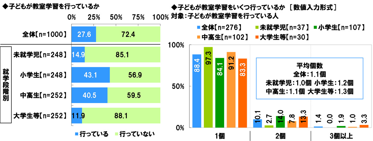 全回答者(1,000名)に、子どもが教室学習(学習塾、英会話、そろばん教室、プログラミング教室など)を行っているか聞いたところ、「行っている」は27.6%、「行っていない」は72.4%となった。