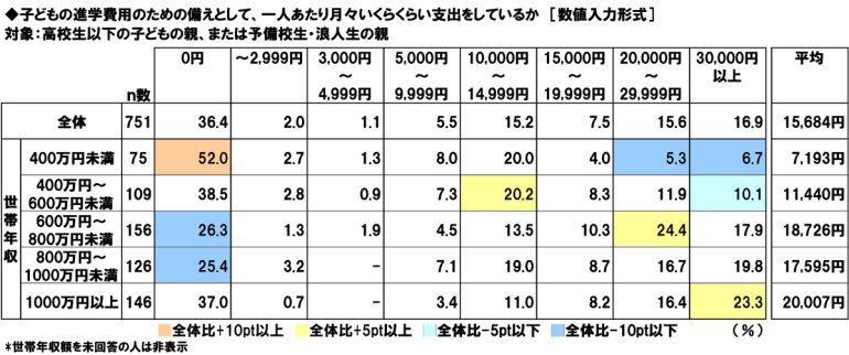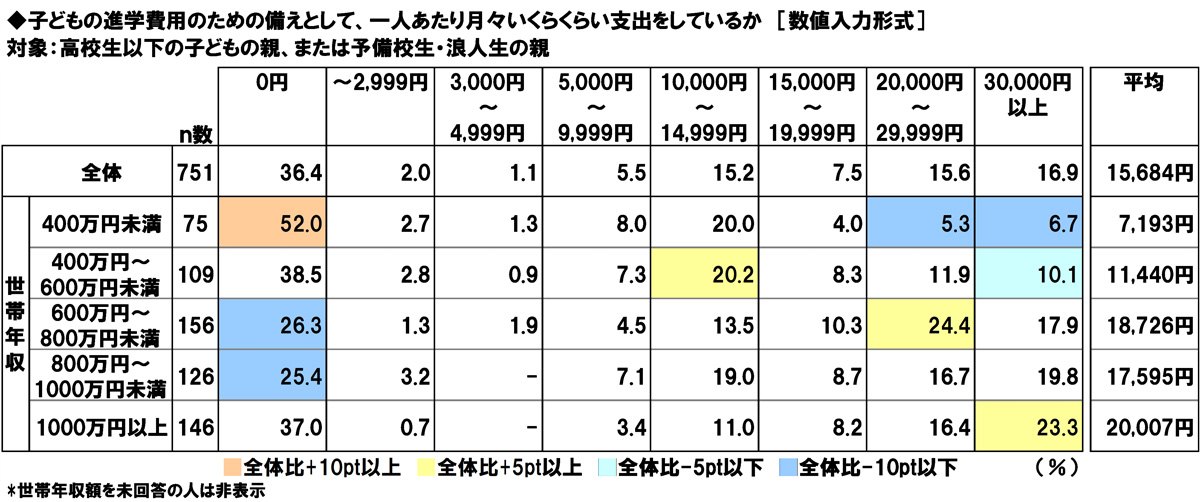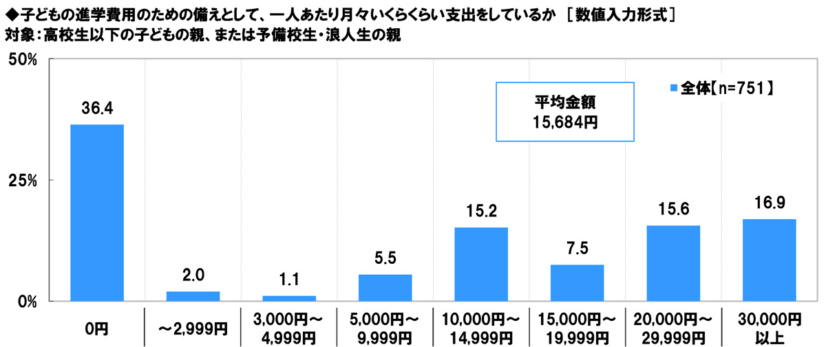 高校生以下の子どもの親、または予備校生・浪人生の親(751名)に、子どもの進学費用のための備えとして、一人あたり月々いくらくらい支出をしているかを聞いたところ、「0円」(36.4%)に最も多くの回答が集まったほか、「10,000円~14,999円」(15.2%)や「20,000円~29,999円」(15.6%)、「30,000円以上」(16.9%)にも回答が集まり、平均は15,684円/月となった。世帯年収別にみると、平均金額は世帯年収が1,000万円以上の人では20,007円/月となった。