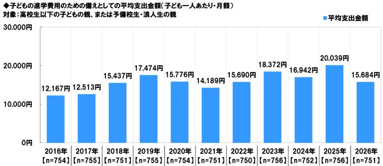 子どもの進学費用のための備え 平均支出金額は15,684円/月、昨年調査から4,355円減少