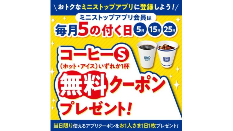 ミニストップでは今月から5の付く日にコーヒーS無料クーポンが配布されるようになりました。毎月5日、15日、25日と3日間、ホットまたはアイスのいずれか1杯が無料で飲めます。