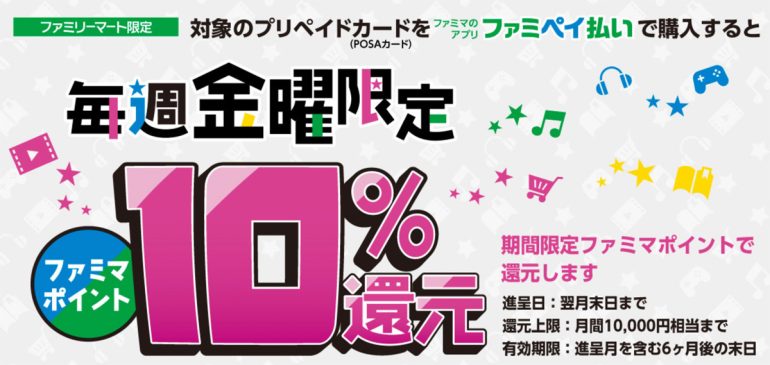 また、ファミリーマートでは毎週金曜日限定で対象のプリペイドカードをファミペイ払いで購入すると10%還元キャンペーンが開催されています。このキャンペーンはいつまでかは特に決まっておらず、しばらくずっと続きます。