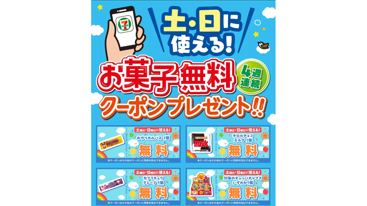 さらにセブン-イレブンでは4月中の毎週土・日はアプリ会員限定でお菓子の無料クーポンが配信されています。毎週土曜日の午前5時までにクーポンが配信され、日曜まで引き換えることができます。毎週対象商品が異なり、たとえばガブリチュウやチュッパチャプスの無料クーポンがあります。