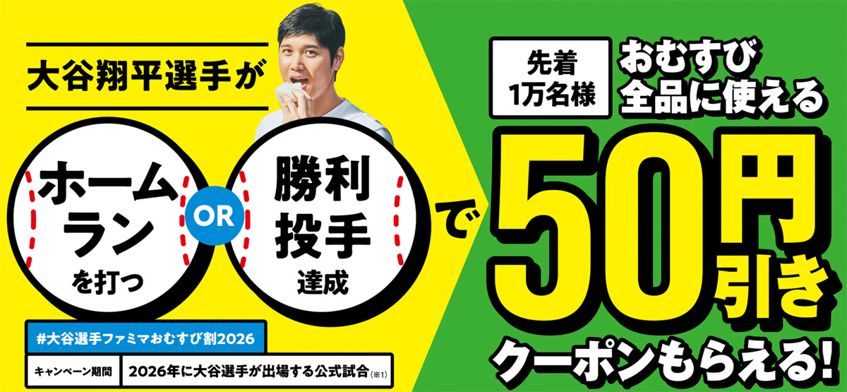 ファミリーマートでは「大谷選手ファミマおむすび割2026」が開催されています。大谷翔平選手が試合で「ホームランを打つ」または「勝利投手になる」のどちらかでファミリーマートのおむすび全品に使える50円引きクーポンが先着1万名に配布されます。キャンペーン期間は今年開催される大谷選手が出場する公式試合なので最長で11月2日(月)までです。