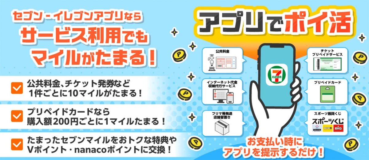 セブン-イレブンアプリではバーコードを提示すると、200円(税抜)につき1マイル貯まります。今までは公共料金の支払いやプリペイドカードの購入ではマイルが貯まりませんでした。それが今年の2月25日(水)から対象になったのです。