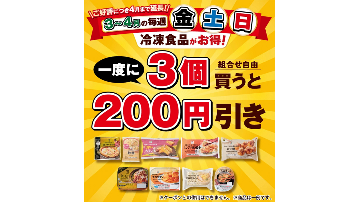 セブン-イレブンでは冷凍食品がお得になるキャンペーンが開催されています。4月中の毎週金・土・日は冷凍食品を一度に3個買うと200円引きになります。アイスクリームやロックアイスは対象外ですが、そのほかの冷凍食品の組み合わせは自由です。