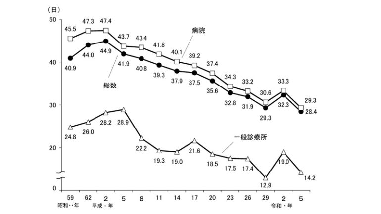 医療の発達から年々入院日数は、減ってきており、全体の入院日数の平均は28.4日、さらに一般診療所においての入院日数の平均は14.2日と約2週間程度となっている。多くの保険では、入院日数の上限を「30日型」「60日型」「120型」から選ぶことができるが、若いうちは最低限の30日型としても十分足りるだろう。