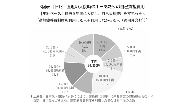 生命保険文化センターの調査によると、1日あたりの自己負担費用は平均で24,300円、費用の分布としては、10,000~15,000円が21.5%と最も多かった。これは、実際入院すると、お見舞いする人の交通費、入院に係り衣類や日用雑貨を購入する等実際医療費、食事代、差額ベッド代以外の費用がかかるからだ。この費用までも保障を受けたい場合は日額15,000円必要となるが、ここまで保障を手厚くすると、その分保険料は高くなってしまうため、入院すること自体わからないであることから保障を手厚くしすぎるのは、あまりおすすめできない。