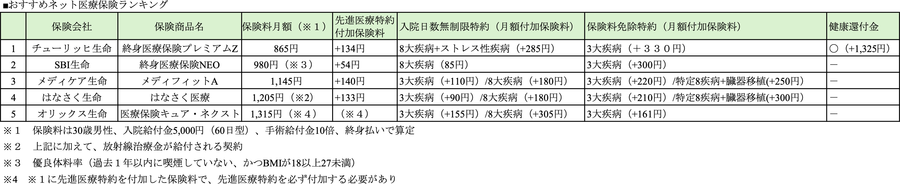 ネット医療保険で、制約なく自由に特約を付加できて選択肢が多く、かつ最低限の保障として30歳男性で、入院給付金5,000円(60日型)、手術給付金10倍、終身払いで保険料が安い順にランキングした。なお、年齢や性別、付加する特約によってその保険料は変わる可能性はあることに留意してほしい。