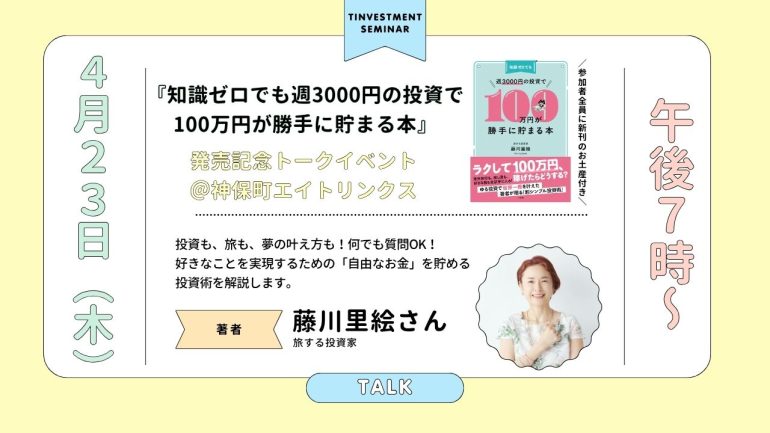 さらに!本イベントでは、参加者全員に藤川里絵さんの新刊『知識ゼロでも週3000円の投資で100万円が勝手に貯まる本』をお渡しいたします。書籍代が通常1760円(税込)のところ、参加費1600円で手に入る大変お得なトークイベントです!ぜひご参加ください。