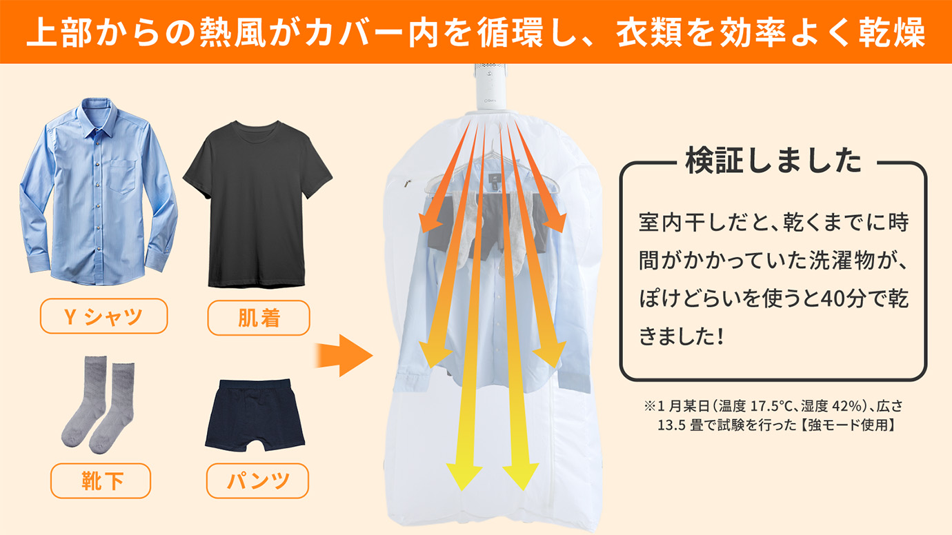 「Qurra ぽけどらい トラベル」は、スーツケースのすき間にもすっと収まる超小型サイズの衣類乾燥機。使い方は簡単で、ドアやハンガーラックに本体につり下げ、付属の衣類カバーをつけるだけでOK。熱風をカバー内で循環させて乾かす設計により、型崩れや衣類縮みのリスクを抑えながら、効率よく乾燥させることができる。