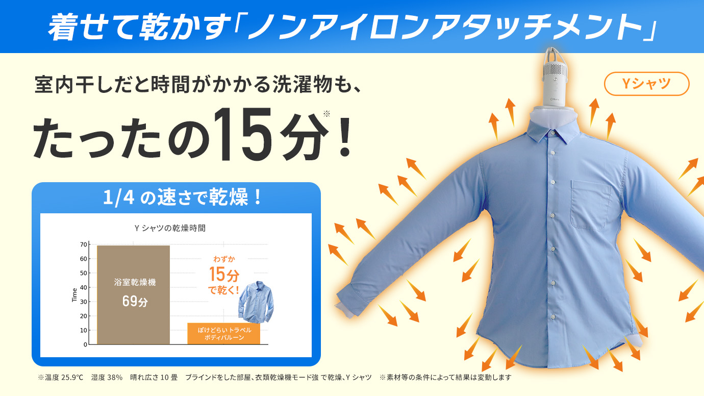 また、衣類を乾かすだけでなく、髪を乾かすヘアドライヤーとしても使うことが可能。さらに、「ボディバルーン(ノンアイロンアタッチメント)」(別売)を利用すれば、シワのばしと乾燥を同時に実現できる。