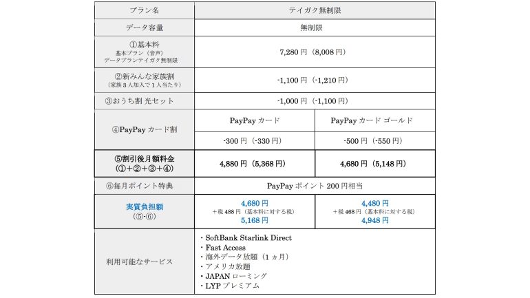 「テイガク無制限」は、無制限のデータ容量を毎月同じ料金で安心して利用可能な料金プラン。加えて「SoftBank Starlink Direct」、「Fast Access」および「海外データ放題(1ヵ月)」が全て追加料金なしで利用可能となっている。