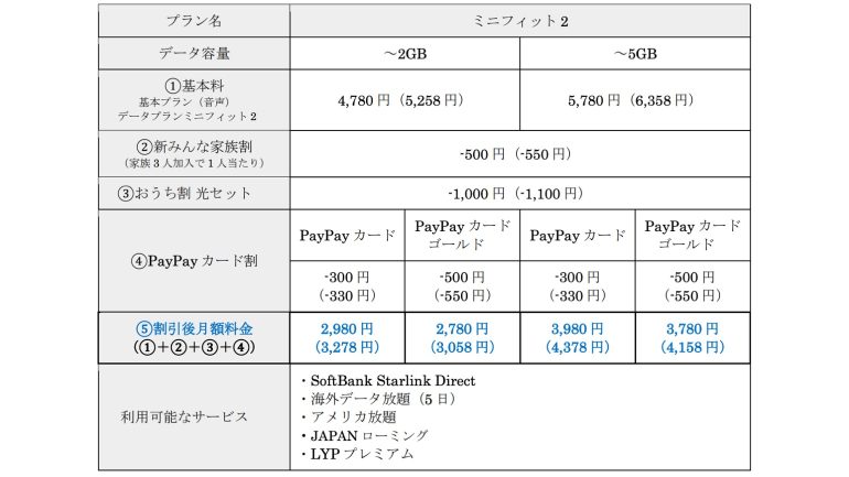 「PayPay カード割」では「PayPay カード ゴールド」向けの割引を新設するとともに、毎月の割引を増額。さらに、「ミニフィット 2」は「新みんな家族割」のカウント対象回線となるだけではなく、家族3人以上がソフトバンクの対象プランに加入の場合、「新みんな家族割」の割引対象プランとして500円(税込み 550円)/月の割引(家族 2人加入の場合は 200円(税込み 220円)/月)が適用される。