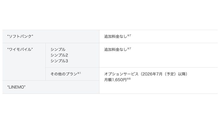 また、“ワイモバイル”でその他のプランの契約者や“LINEMO”の契約者は、2026年6月末(予定)まで申し込み不要、追加料金なしで利用が可能だ。2026年7月(予定)以降は、オプションサービス(月額1650円)の申し込みが必要になる。
