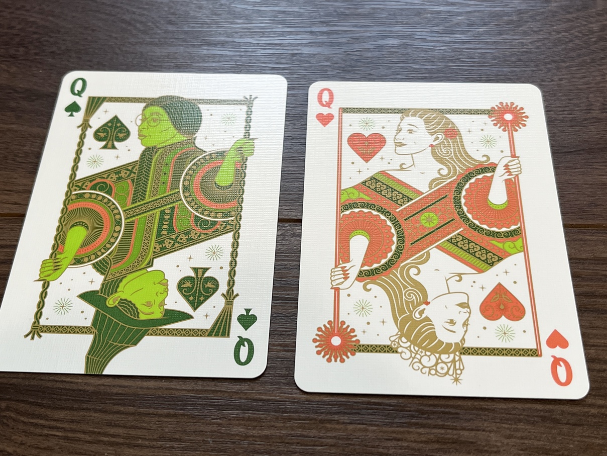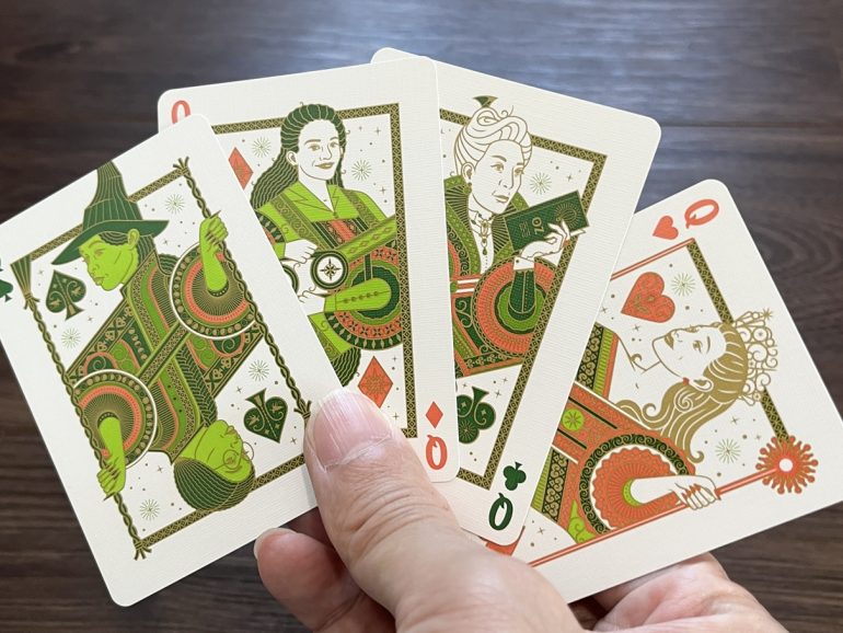 絵札(コートカード)のデザインも、まさにファン垂涎のクオリティだ。ジョーカーには「オズ陛下」が鎮座し、クイーンには「エルファバ」「グリンダ」「マダム・モリブル」といった主要キャラクターたちが、映画公式のデザインで美しく描かれている。