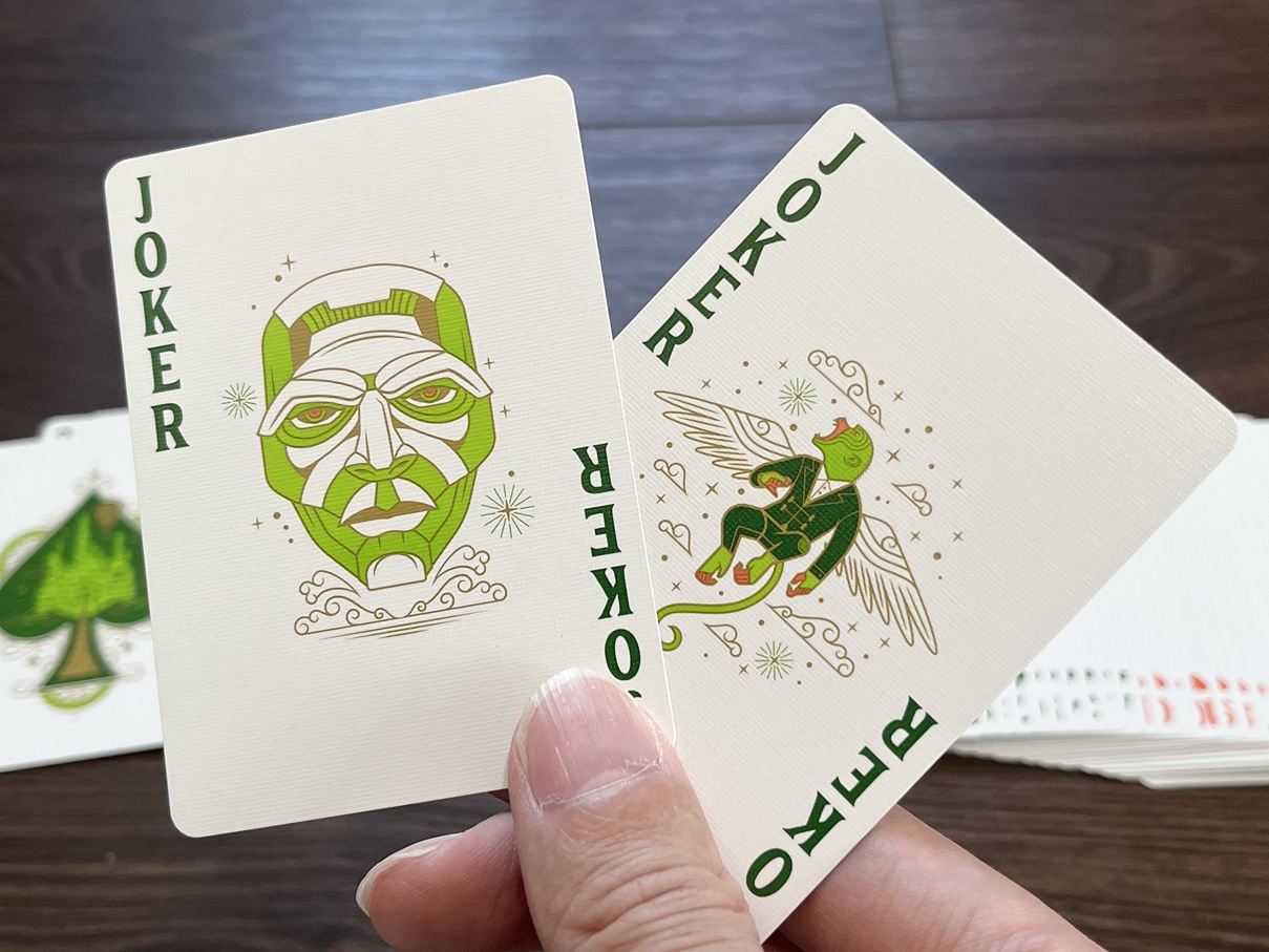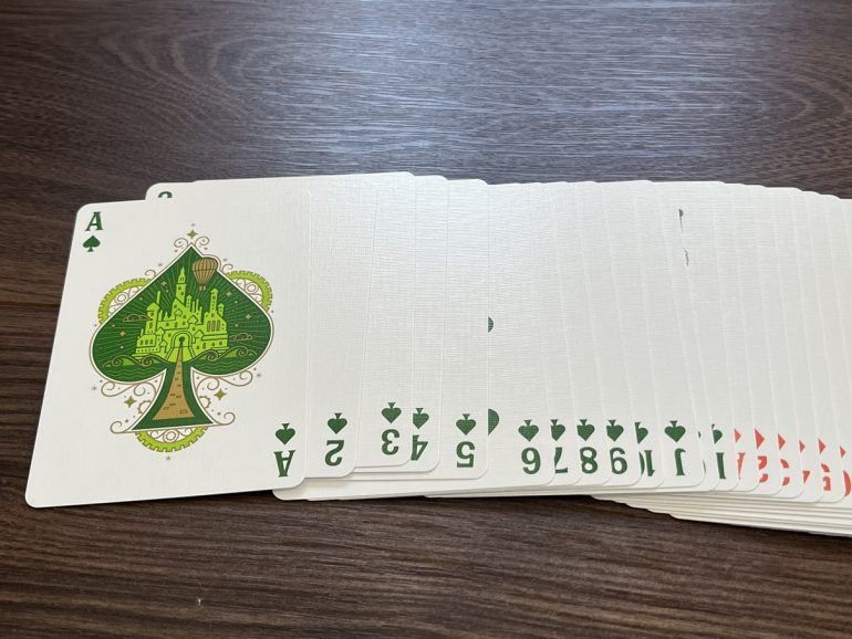 カード本体を取り出すと、そこにはさらなる驚きが待っている。まず目に飛び込んでくるのは、カードの配色である。通常のトランプであればスペードやクローバーには黒が用いられるが、本製品ではなんと「グリーン」が採用されている。