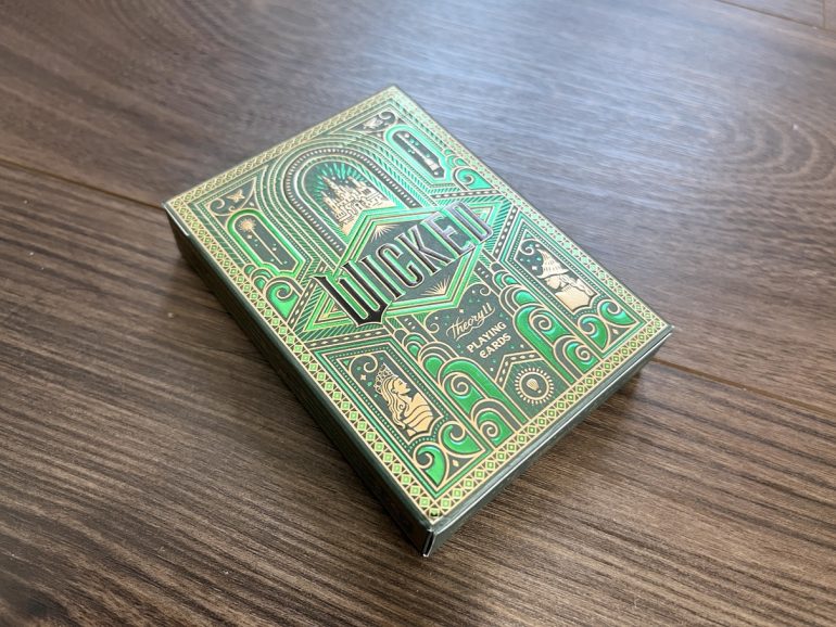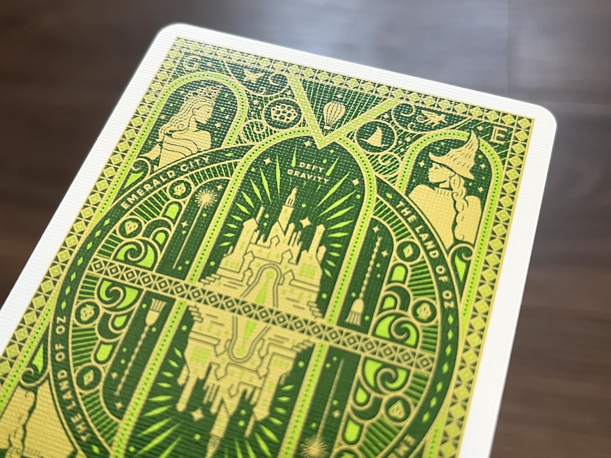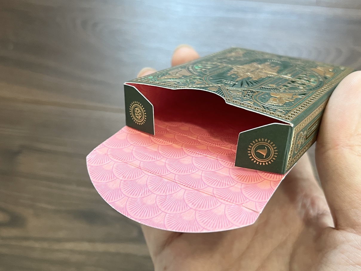 まず、手に取った瞬間に圧倒されるのが、そのパッケージ(タックケース)の完成度だ。深いエメラルドグリーンをベースに、精密なゴールドの箔押しが施された佇まいは、もはやトランプの箱という概念を超え、一つの独立したアートピースとしての輝きを放っている。