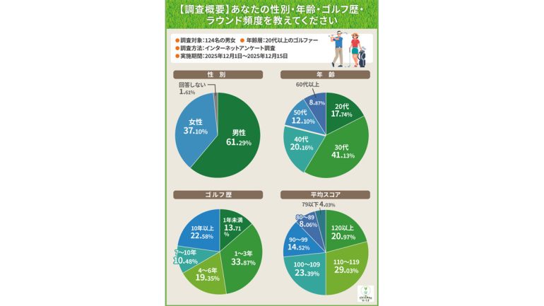本調査において回答者の年齢層は30代が37.7%と最も多く、次いで40代が27.2%を占めていた。ゴルフ歴では3年以上の層が38.9%で最多となった一方、1年未満の層も合計36.0%にのぼり、初心者から経験者まで幅広い層からの回答が集まった。