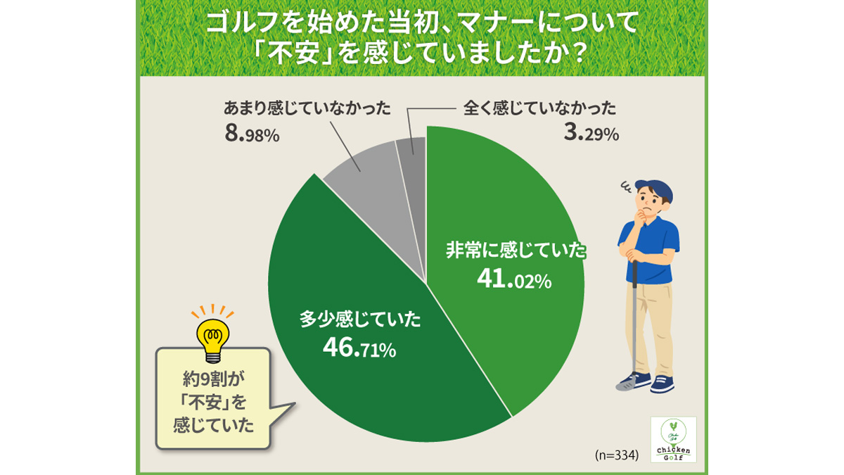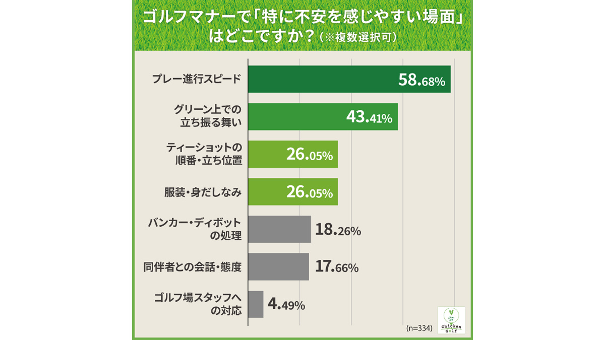 そこで、セミパーソナルゴルフレッスン「チキンゴルフ」を展開するクリアはこのほど、運営メディア「ゴルフの学び舎」にて、20代以上のゴルファー334名を対象に「初心者ゴルファーが不安に感じるゴルフマナー」に関するアンケート調査を実施し、その結果を発表した。