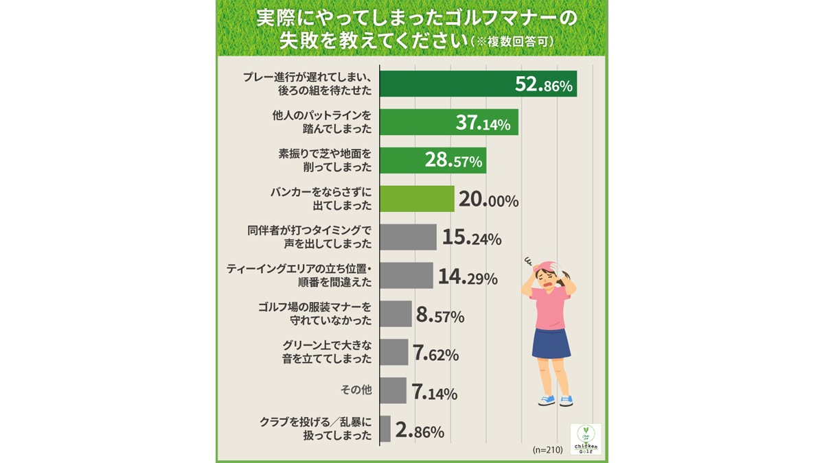 実際に経験した失敗の1位も「プレー進行が遅れてしまい、後ろの組を待たせた(52.9%)」であり、不安に感じている場面と実際の失敗が一致していることがわかる。