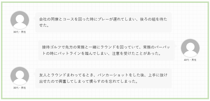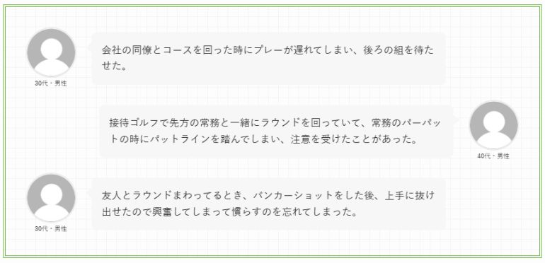 特にビジネスゴルフや接待の場面では、マナー違反が相手との関係性に直結しうるため、心理的なダメージがより大きくなる傾向があると考えられる。