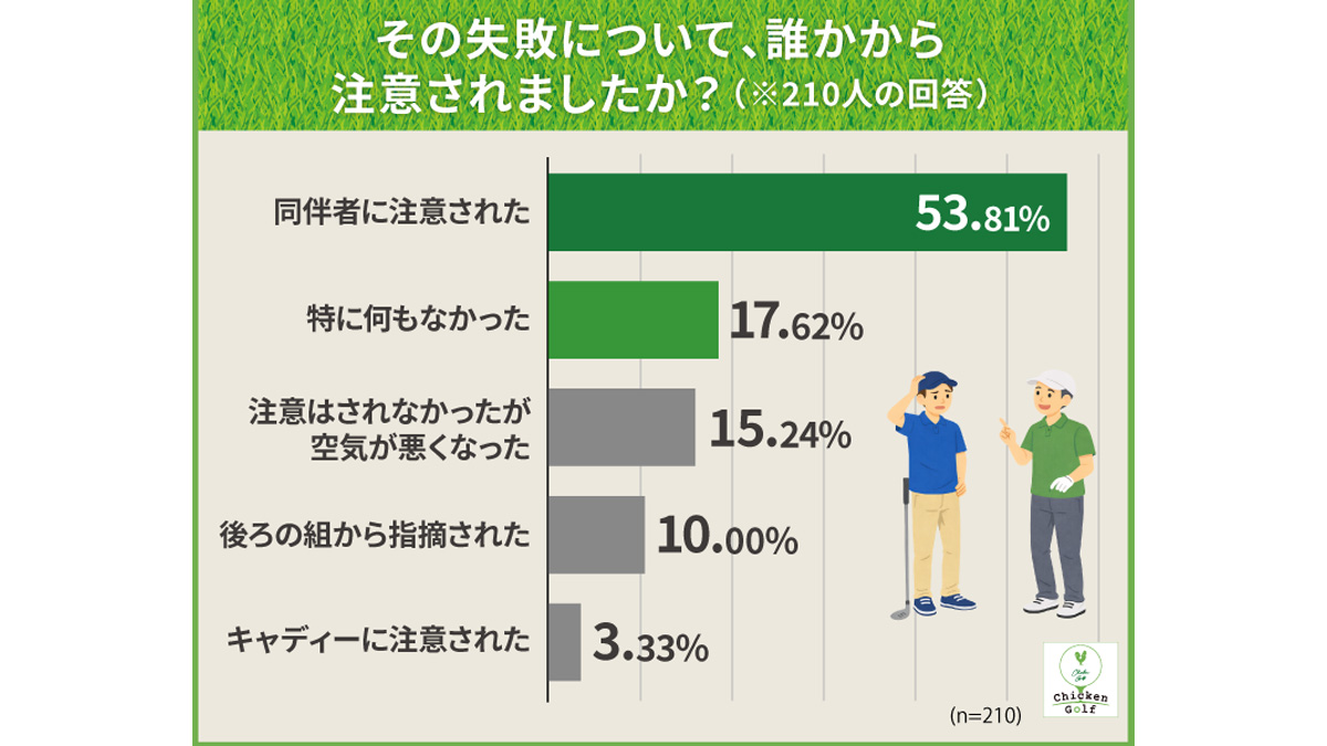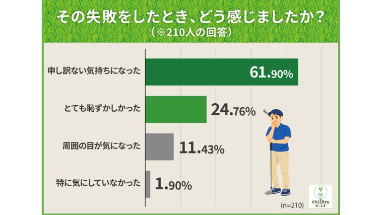 次いで「とても恥ずかしかった」が24.8%、「周囲の目が気になった」が11.4%と続いており、多くのゴルファーがマナーの失敗に対して強い心理的な負担を感じていることがうかがえる。