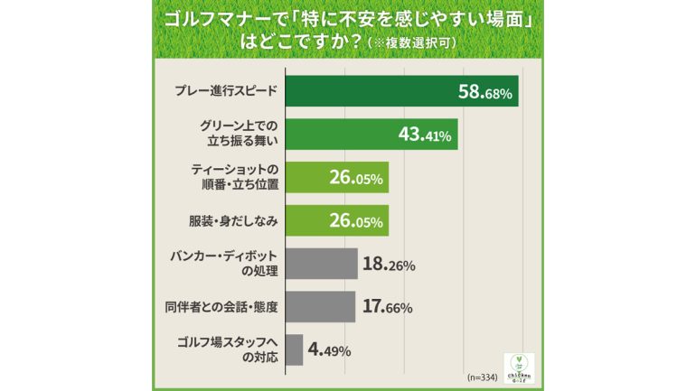 ゴルフマナーで「特に不安を感じやすい場面」について複数回答で調査したところ、「プレー進行スピード」が58.7%(196名)で最多となり、2位以下に15ポイント以上の差をつける結果となった。