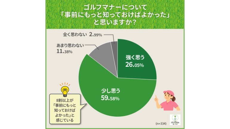 マナーについて「事前にもっと知っておけばよかった」と思うかを調査したところ、「強く思う(26.0%)」「少し思う(59.6%)」を合わせて、85.6%のゴルファーが「事前にもっと知っておけばよかった」と回答した。