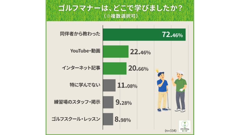 ゴルフマナーをどこで学んだかを複数回答で調査したところ、「同伴者から教わった」が72.5%(242名)で圧倒的に多い結果となった。