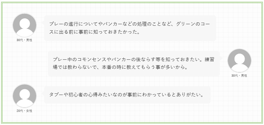 これらは一見すると基本的な項目だが、ゴルフ場ごとにドレスコードが異なったり、ティーイングエリアでの立ち位置に明確なルールがあったりと、事前に知っていなければ対応しにくいマナーであることが、不安につながっていると推察される。