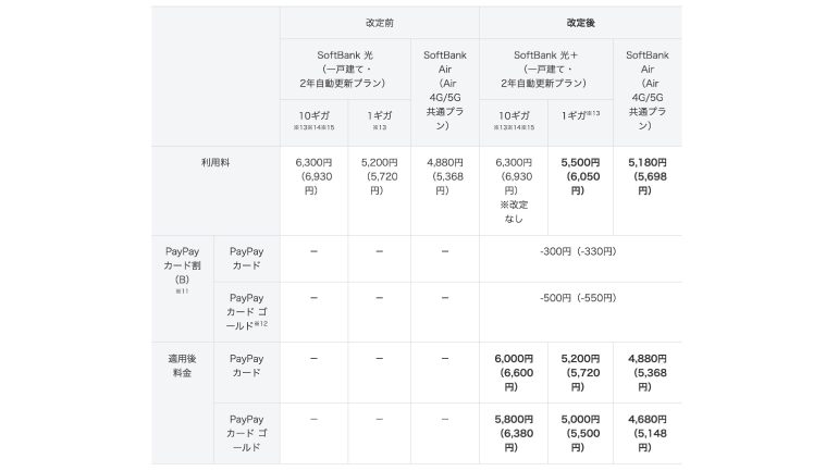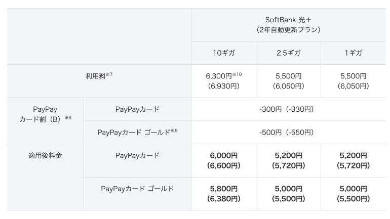 例えば、「SoftBank 光・10ギガ」(一戸建て・2年自動更新プラン)の場合、2026年12月以降も引き続き月額利用料は6300円(税込6930円)(※6)になるが、「PayPayカード割(B)」が適用されると「PayPayカード」の場合は6000円(税込み6600円)、「PayPayカード ゴールド」の場合は5800円(税込6380円)の割引適用後料金で利用できる。