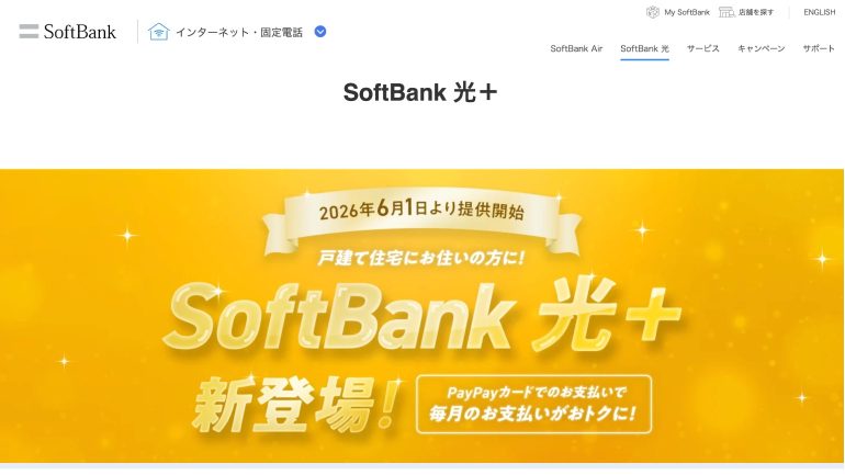 ソフトバンクは2026年6月1日より新しい光ブロードバンドサービス「SoftBank 光+(プラス)」の提供を開始する。この「SoftBank 光+」は、「PayPayカード割(B)」の適用により、おトクに高速の光回線を利用できるサービスだ。