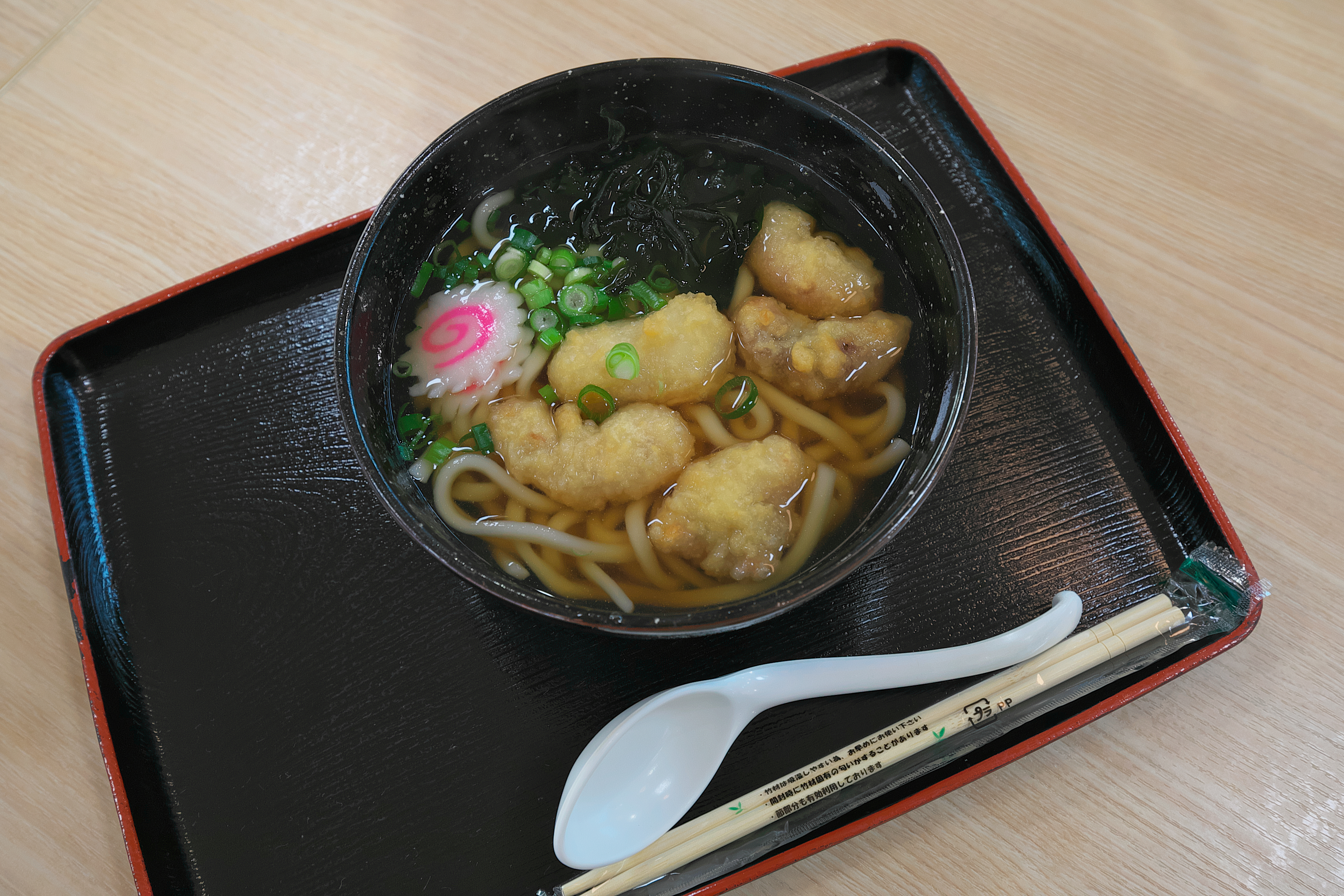 そんな中、今回大浜PA下りで食べたのは、スナックとして販売されているだけでなく、天丼やカレーにも使われているたこ天をのせたたこ天うどん890円としまなみレモンとハチミツのスフレパンケーキコーヒー付950円。